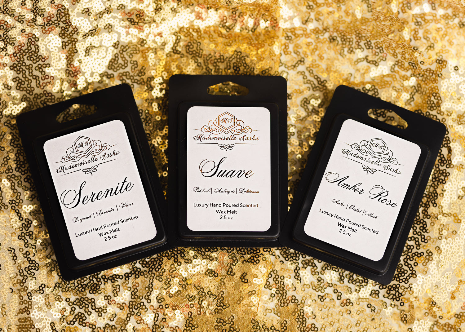 Indulge in the rich, captivating fragrances of Mademoiselle Sasha's Luxury Wax Melts....